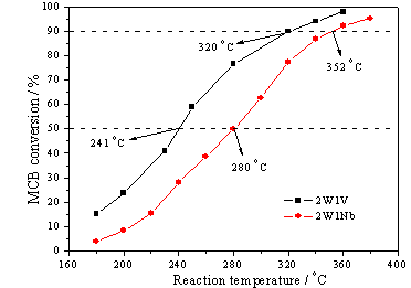 Catalytic combustion of MCB onWO3-Nb2O5(2W1Nb) and WO3-V2O5(2W1V).