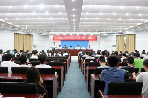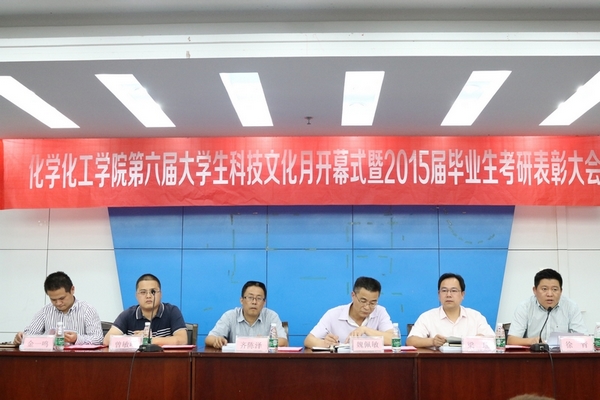 在图书馆一楼报告厅举行第六届大学生科技文化月开幕式暨2015届毕业生考研表彰大会,校学工部、团委负责人和黑白体育