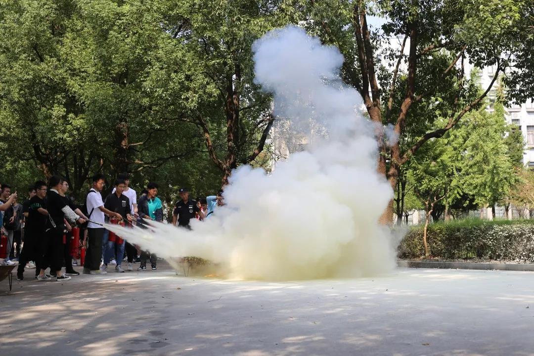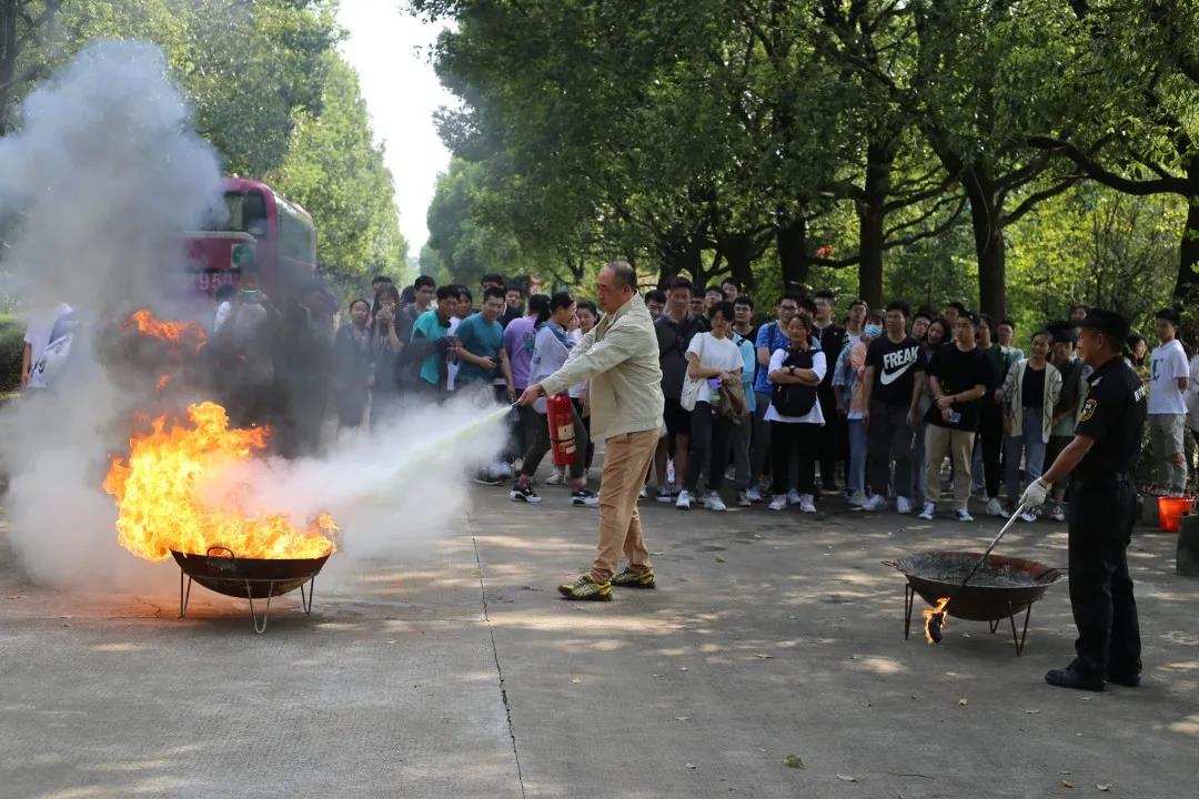 由学校保卫处老师向同学们讲解各类火源的处理方式以及使用灭火器灭火时的注意事项,强调灭火时人要站在上风处,并对准火源根部进行扑灭。然后,保卫处老师使用干粉灭火器进行了灭火操作示范。最后,同学们分组练习使用干粉灭火器进行灭火操作。