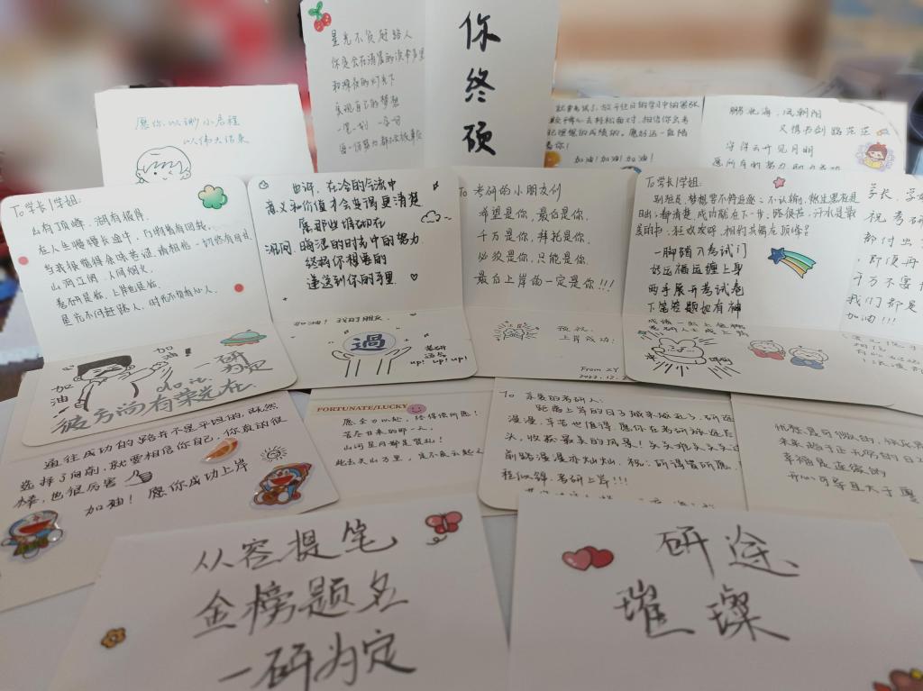 领导为考研(博)学生送上了精心准备的学习文具和防疫礼包。来自低年级学生的暖心贺卡,在寒冷的冬日里给考研学子送上了温暖和祝福。