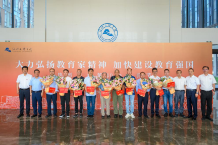 施惠芳向郁志新、沈润溥等教师代表送上鲜花,感谢他们对教育事业做出的积极贡献。