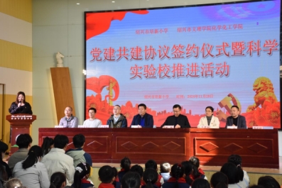 为进一步培养学生的科学综合素养,助力科学教育走深走实,全力推动科学教育高质量发展,11月28日下午,我院党委与绍兴市培新小学党支部在培新小学体艺馆开展党建共建协议签约暨科学实验校推进活动。绍兴市培新小学党支部书记姚城、副校长阮黎明,黑白体育