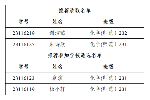 根据《nba黑白直播 “祖楠班”实施管理办法》(绍黑白体育 办发〔2023〕5号)、《黑白体育 “祖楠班”选拔实施办法》,经学生自主申请,黑白体育 综合评审,拟推荐录取谢洁璐等2位学生为第十四期卓越教师养成班“祖楠班”学员,拟推荐章演等2位学生参加学校统筹名额遴选。现予以公示,具体名单如下: