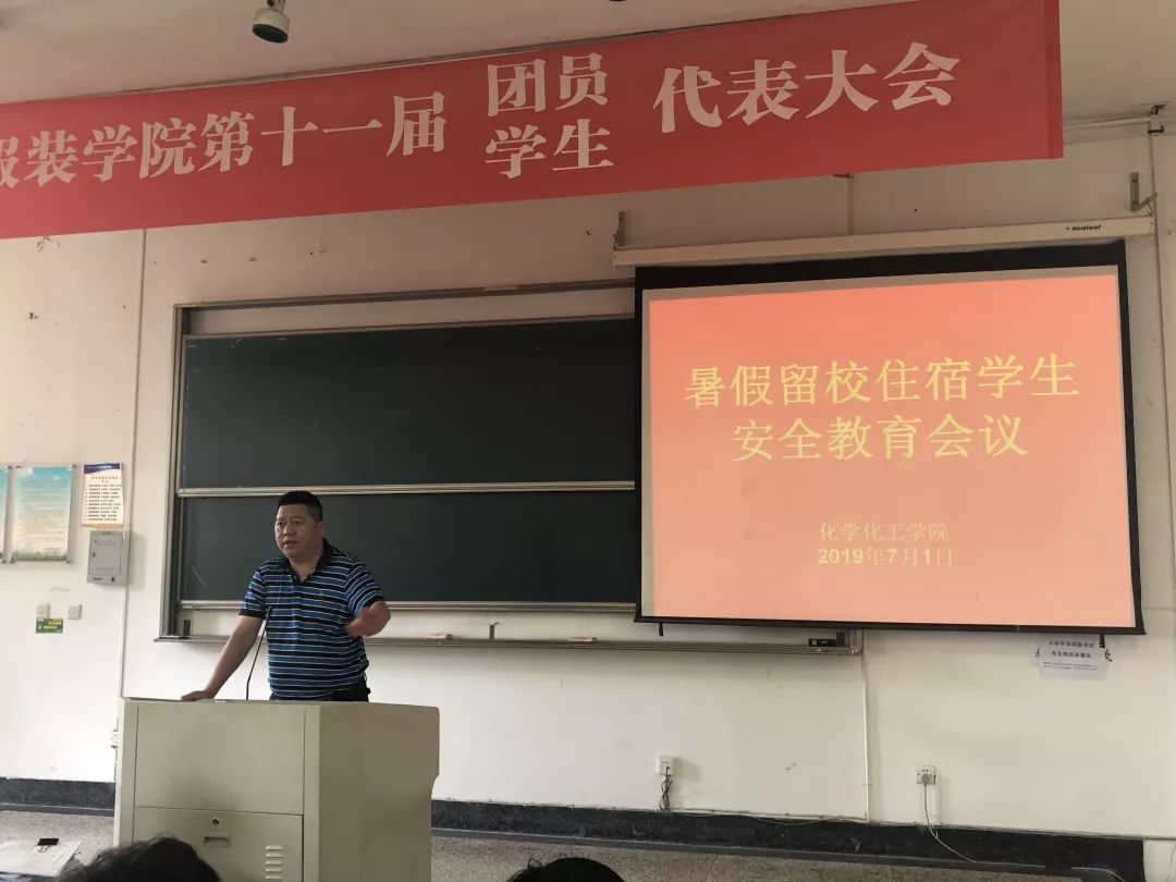 2019�7�1日下午,化学化工学院2019年暑假留校住宿学生安全教育会议在理工�134教室顺利召开。学院党委副书记徐青老师、学生科副科长章江燕老师、树人书院负责人田晓彦老师、学院研究生辅导员赵健老师以及全体留宿学生参加,会议由韩超峰老师主持�