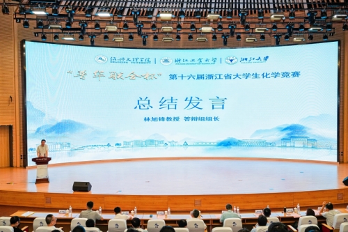 在闭幕式上,柳国庆,浙江省高等学校大学化学课程教学指导委员会主任委员、浙江省大学生化学竞赛专家委员会主任委员、浙江大学方文军教授,林旭锋教授,强根荣教授,绍兴文理学院教务处处长方小利教授,浙大宁波理工学院教务处长沈昊宇教授,丽水学院生态学院院长郭圣荣,绍兴文理学院化学化工学院院长钟文武教授,浙江工业大学实验中心副主任刘秋平副教授,以及赛事评委和参赛师生近500人参加。闭幕式由潘华泉主持。