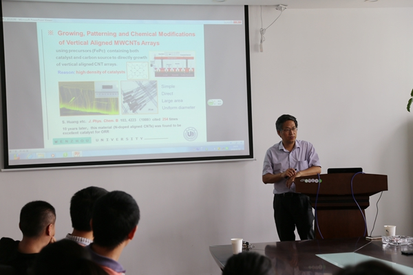黄少铭教授主讲了《Nano-structured Carbon Materials》,他从Why Carbon:magic element;Carbon Nanotubes(CNTs);Application of Nano-structured Carbons(Platform for chem./bio sensors based on CNT arrays; Single SWCNT nanopore for DNA sequencing; Energy-related Applications; Carbon Quantum Dots(CQDs) for bio-imaging)三个方面向与会人员介绍了纳米碳材料。