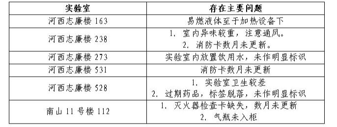 国庆假期临近,为扎实筑牢假期开放实验室安全防线,切实保障教学科研资产与师生安全,黑白体育 安全检查小组于9月30日前往河西志廉实验楼、南山分析测试中心、脂溶性维生素浙江省工程研究中心、新能源研究所等重点区域,对各教学实验室与科研实验室开展全面检查。本次检查聚焦危化品储存与使用规范、消防设施有效性、过期药品处置、固液废弃物分类、实验室环境卫生等关键环节。经过认真检查和评估,安全小组发现少量问题和不足,现将存在问题的实验室进行通报并限期整改。